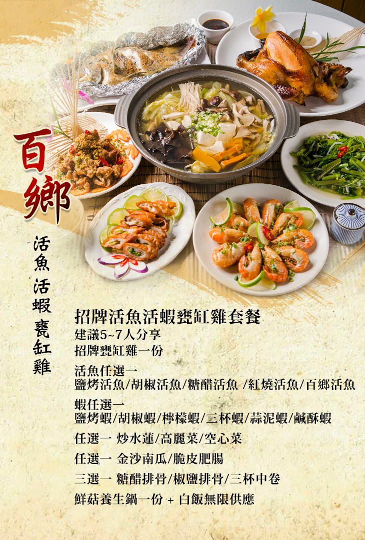 招牌甕缸雞一份 + 鹽烤活魚/胡椒活魚/糖醋活魚/紅燒活魚/百鄉活魚 任選一 + 鹽烤蝦/胡椒蝦/檸檬蝦/三杯蝦/蒜泥蝦/鹹酥蝦 任選一 + 炒水蓮/高麗菜/空心菜 任選一 + 金沙南瓜/脆皮肥腸 任選一 + 糖醋排骨/椒鹽排骨/三杯中卷 三選一 + 鮮菇養生鍋一份 + 白飯無限供應