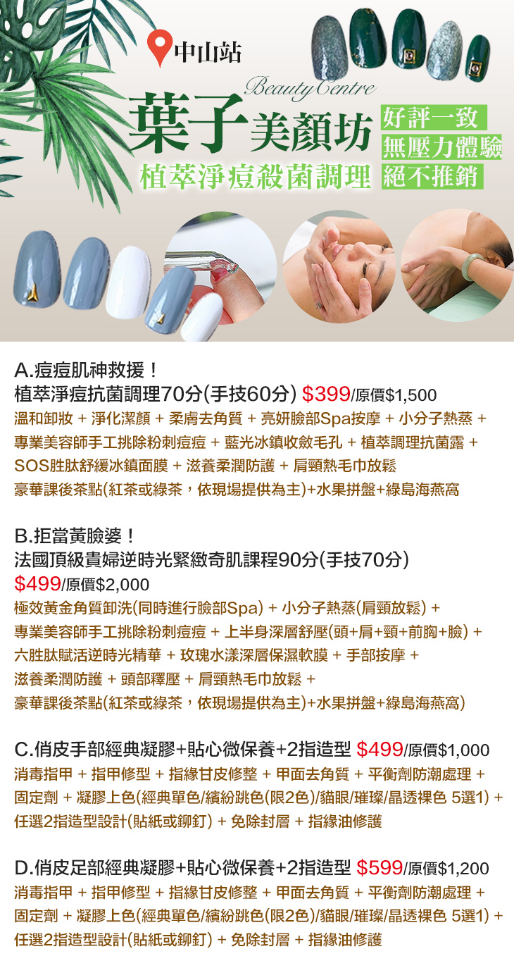 A.痘痘肌神救援!植萃淨痘抗菌調理70分(手技60分) / B.拒當黃臉婆!法國頂級貴婦逆時光緊緻奇肌課程90分(手技70分) / C.俏皮手部經典凝膠+貼心微保養+2指造型 / D.俏皮足部經典凝膠+貼心微保養+2指造型