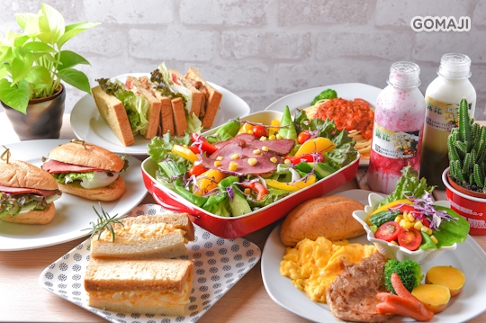 照燒雞腿沙拉、低脂雞肉沙拉、沙拉蛋潛艇堡、五榖黑米飯套餐、派對甜蜜世界、咖啡、鮮果汁、茶飲、厚片土司等