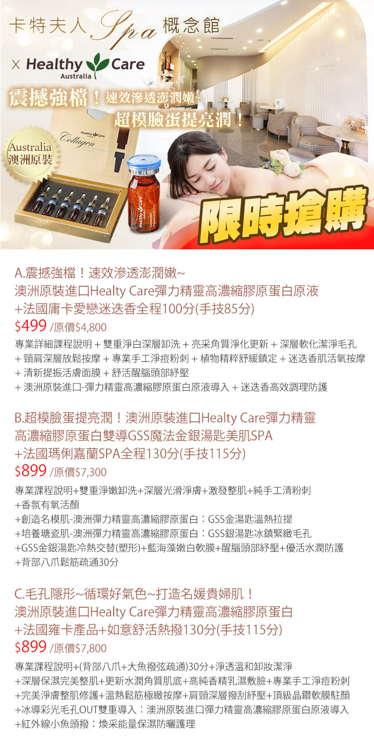 A.震撼強檔!速效滲透澎潤嫩~澳洲原裝進口Healty Care彈力精靈高濃縮膠原蛋白原液+法國庸卡愛戀迷迭香全程100分(手技85分) / B.超模臉蛋提亮潤!澳洲原裝進口Healty Care彈力精靈高濃縮膠原蛋白雙導GSS魔法金銀湯匙美肌SPA+法國瑪俐嘉蘭SPA全程130分(手技115分) / C.毛孔隱形~循環好氣色~打造名媛貴婦肌!澳洲原裝進口Healty Care彈力精靈高濃縮膠原蛋白+法國雍卡產品+如意舒活熱撥130分(手技115分)