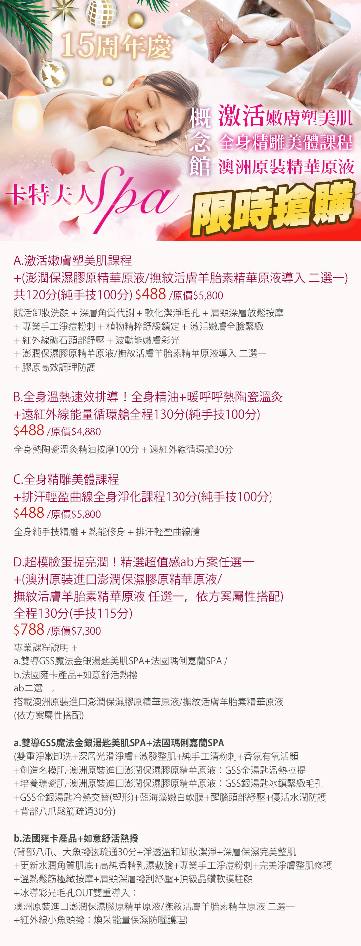 A.激活嫩膚塑美肌課程+(澎潤保濕膠原精華原液/撫紋活膚羊胎素精華原液導入 二選一)共120分(純手技100分) / B.全身溫熱速效排導!全身精油+暖呼呼熱陶瓷溫灸+遠紅外線能量循環艙全程130分(純手技100分) / C.全身精雕美體課程+排汗輕盈曲線全身淨化課程130分(純手技100分) / D.超模臉蛋提亮潤!精選超值感ab方案任選一(搭載澳洲原裝進口澎潤保濕膠原精華原液/撫紋活膚羊胎素精華原液,依方案屬性搭配)全程130分(手技115分)