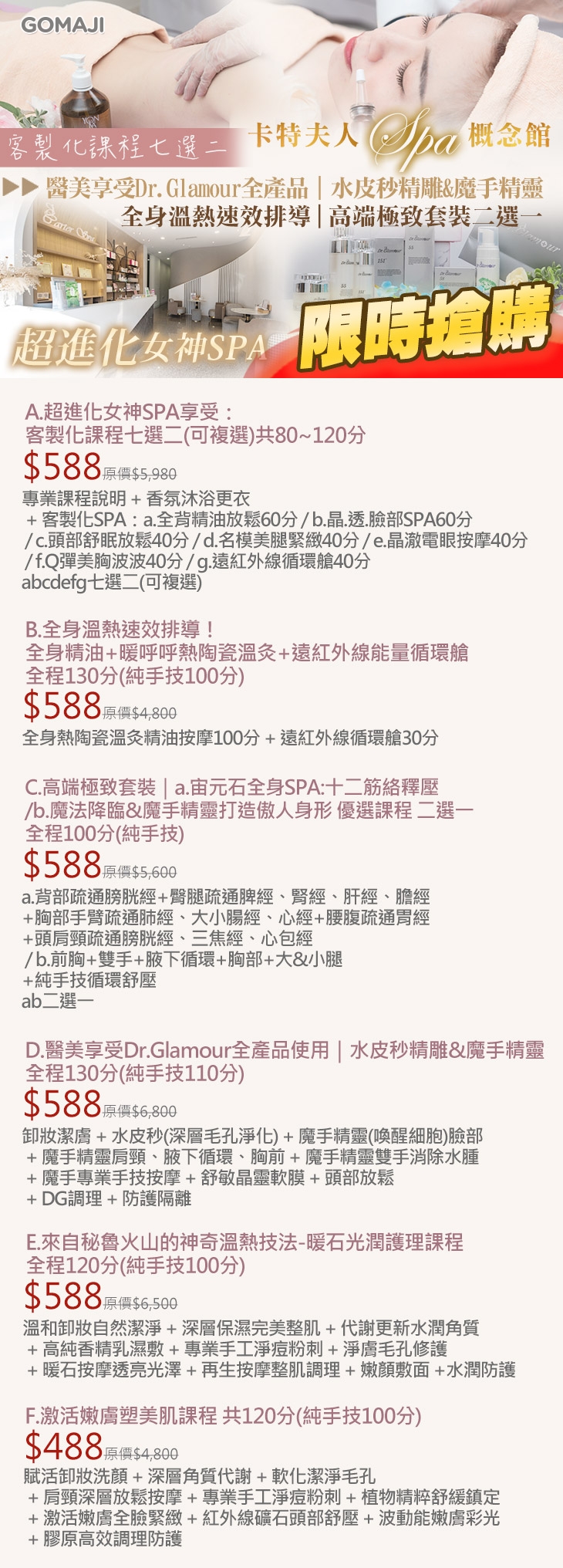 A.超進化女神SPA享受:客製化課程七選二(可複選)共80~120分/B.全身精油+暖呼呼熱陶瓷溫灸+遠紅外線能量循環艙全程130分/C.a.宙元石全身SPA/b.魔法降臨&魔手精靈傲人身形 二選一全程100分/D.醫美享受Dr.Glamour全產品使用|水皮秒精雕&魔手精靈全程130分/E.來自秘魯火山的神奇溫熱技法-暖石光潤護理課程 全程120分(純手技100分)/F.激活嫩膚塑美肌課程 共120分(純手技100分)