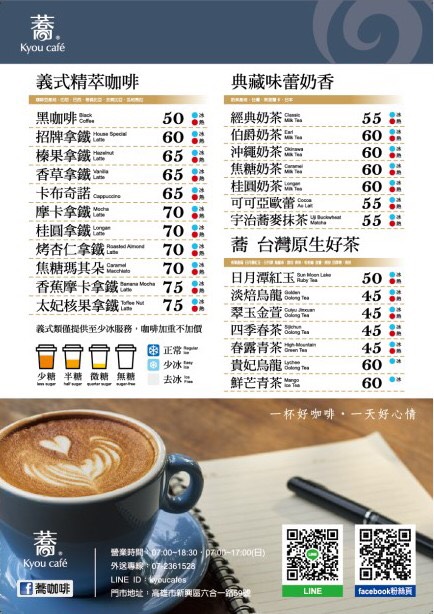 瀰漫著多層次的香氣,誘惑著味蕾慾望,溫暖的氛圍讓人深深陷入~提供各式經典咖啡和創意飲品,滿足飲料控的味蕾,清新茶香,溫潤醇厚,金黃動人的茶色,讓您視覺味覺都解渴,每一口都是好茶!並運用食材創造出驚喜組合,給你各種超乎想像的好滋味!