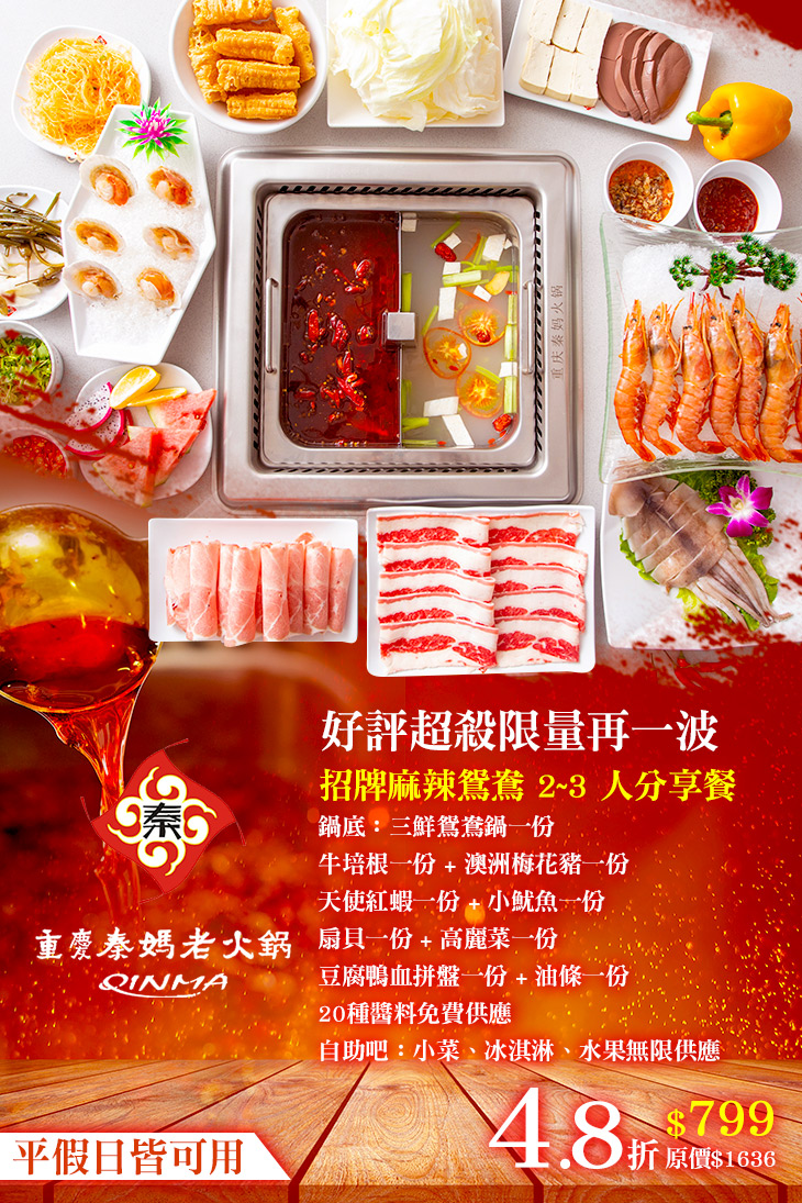 全球逾 700 間分店國際知名餐飲連鎖品牌【重慶秦媽火鍋】來台首間分店!榮獲不少媒體採訪報導!重慶秦媽火鍋採用重慶大巴山的辣椒、花椒及秦媽獨門天然香辛料,經中央工廠自動化熬煮湯頭,鮮而不膩,打造天然、健康的口感。更令人為之驚豔的是,秦媽多道獨門功夫菜:霸王牛肉、功夫酥肉、玫瑰牛肉丸、現磨黑豆腐、重慶苕粉等特色料理與台灣當地的口味結合,重新挑戰市場接受度!同時,以綠色健康為主要述求,屏除一般吃鍋又油又膩的刻板印象。
