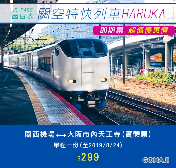 只要299元,即可享有【日本-JR PASS 西日本 關空特快列車HARUKA】關西機場↔大阪市內天王寺(實體票)單程一份(至2019/8/24)