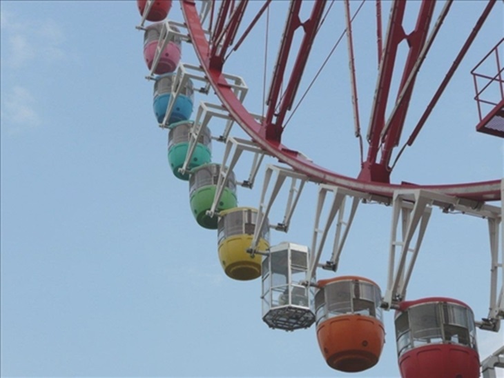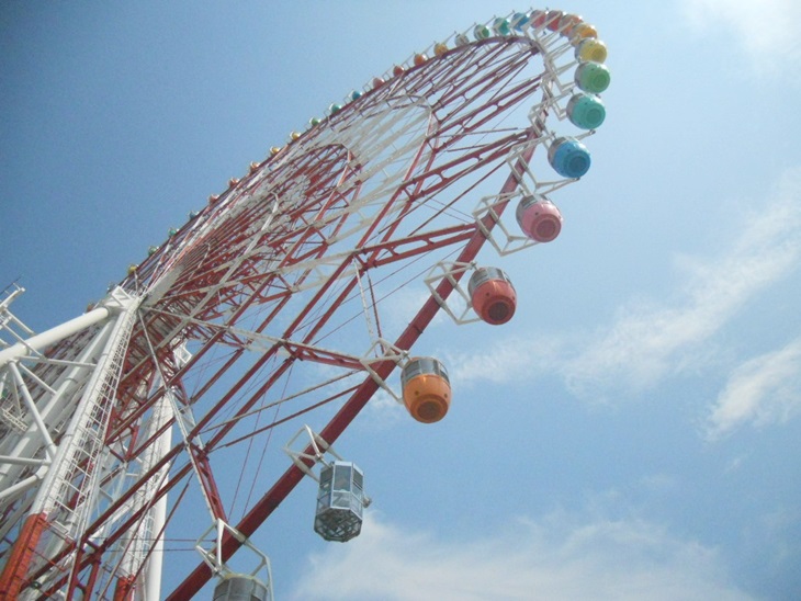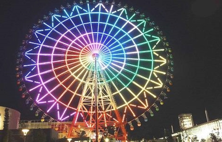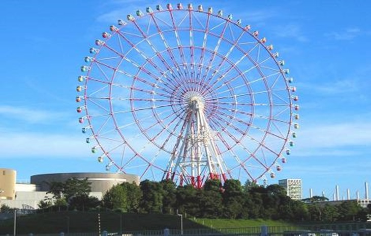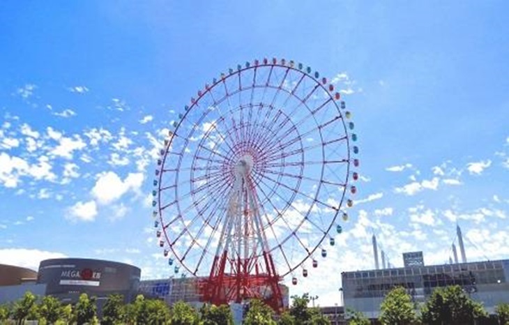 東京台場的彩虹摩天輪高達 115 公尺,是台場的代表性設施。部分車廂為全透明的包廂,乘坐時可無死角的俯瞰東京美景。台場位置倚靠著東京灣,搭乘台場彩虹摩天輪不僅可以將夕陽餘暉下波光粼粼的東京灣盡收眼底,白天天氣好時還可以眺望到富士山、東京鐵塔、天空樹等知名地標;夜晚更可將東京閃耀的夜景一覽無遺。