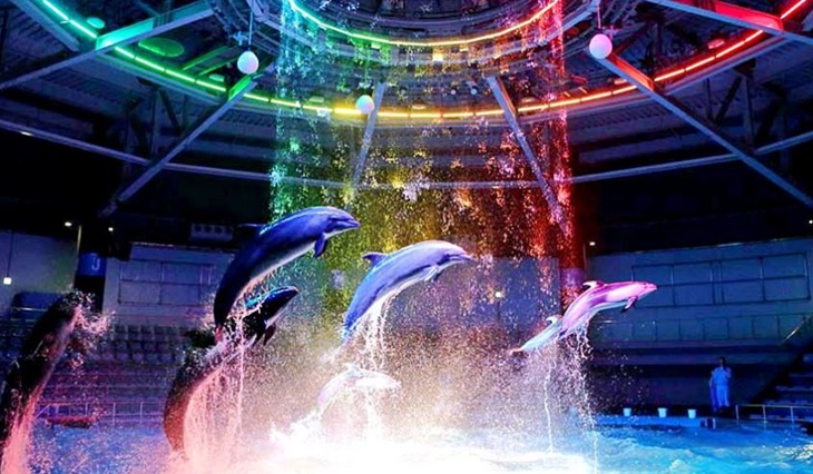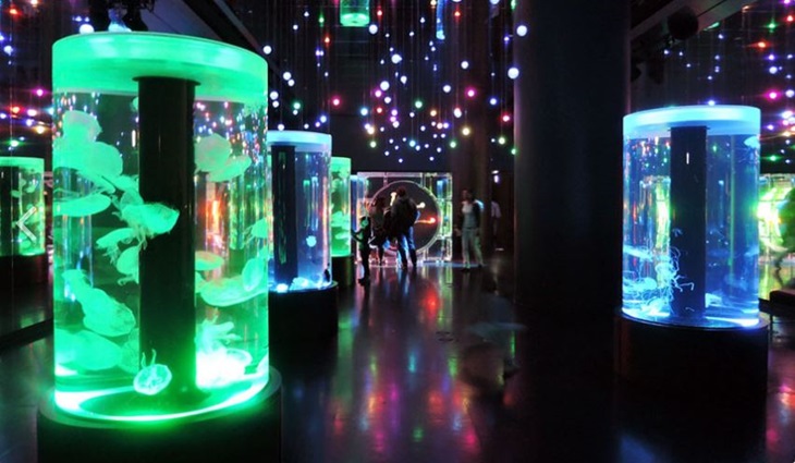東京最具都會潮流感的品川水族館 Maxell Aqua Park,極具設計感的外觀十分顯眼。館內設有多個主題區,結合觸控面板、燈光與音效,讓海洋生物顯得更為夢幻。一樓有珊瑚主題咖啡吧、觸控互動水族箱、水母優游區、旋轉木馬,二樓有繽紛熱帶魚區、浪漫海底隧道,還有海豚秀的表演劇場。