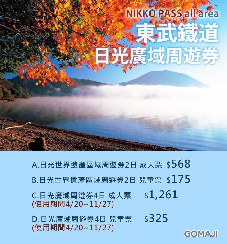 為期四天有效的全日光周遊券,適合想玩遍日光、鬼怒川、中禪寺湖每個角落的旅客。