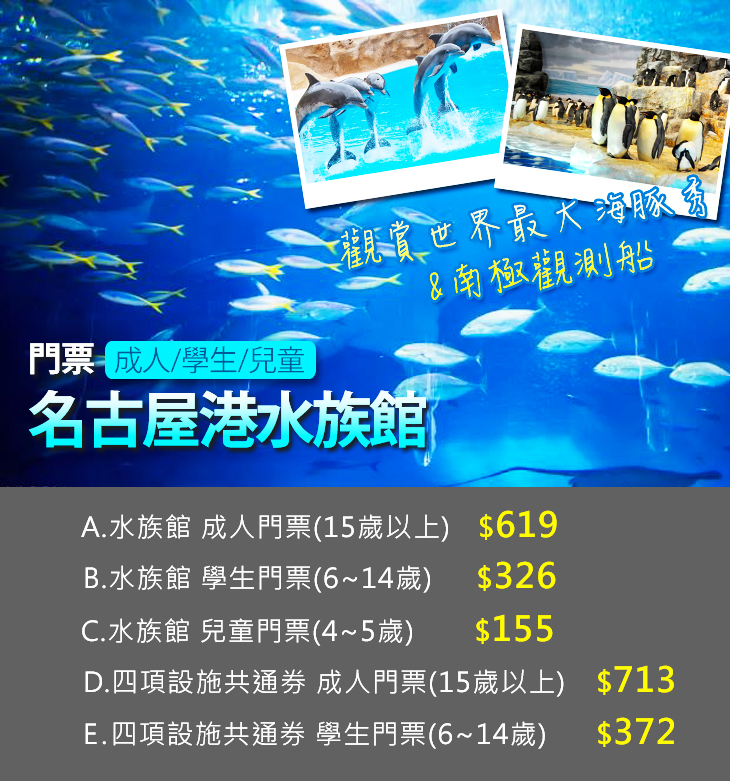 名古屋港水族館是名古屋的人氣景點,以世界最大的海豚秀最為知名,館內除了水族館外,還有南極觀測船、名古屋港海洋博物館、港口大展望台等一共四館,四館共通券可以讓你一天之內暢遊在各大展館中,一起和可愛的虎鯨、小白鯨、企鵝、海豚玩樂吧!
