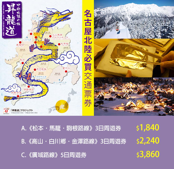 A.《松本.馬籠.駒根路線》3日/B.《高山.白川鄉.金澤路線》3日/C.《廣域路線》5日周遊券
