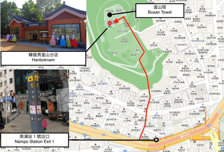 ・搭乘地鐵 1 號線至南浦站下車, 1 號出口出站後,步行 10 分鐘(約 580 公尺)即可抵達