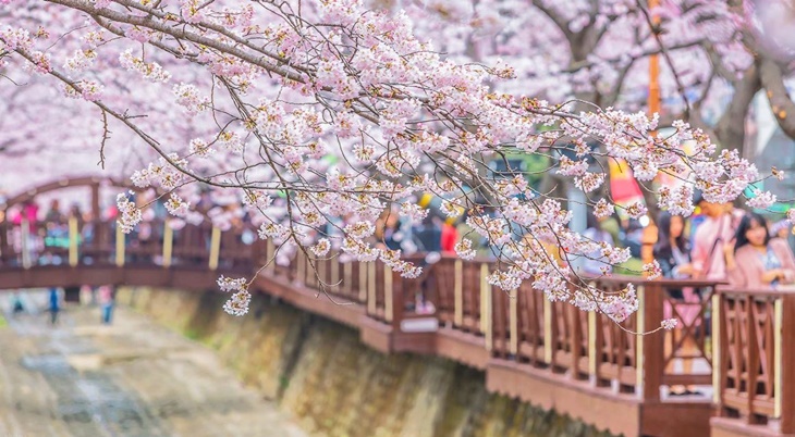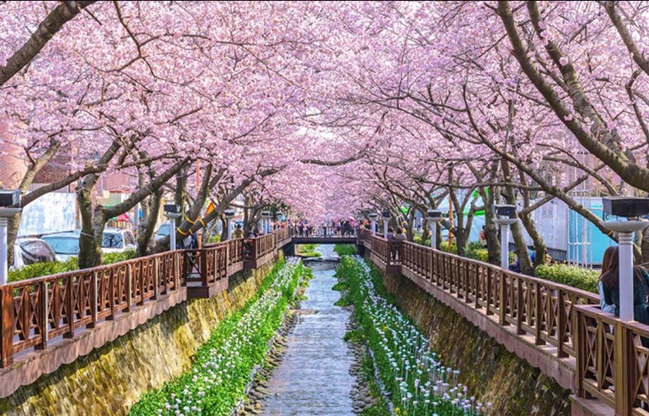 流經鎮海市區的余佐川,從入口處直到鎮海女高長達1.5公里的櫻花隧道,是軍港節期間旅客川流不息的景點。河床上每一段都有不同的裝置藝術,部份區段還開放參觀,你可漫步在河床兩側的步道,感受浪漫的櫻花雨。