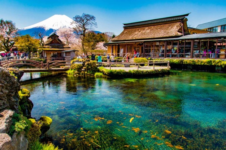 有日本九寨溝之稱的忍野八海,座落於日本山梨縣山中湖與河口湖之間的湧泉群,因錯落有致地散布著八座清泉,因而得名。忍野的自然環境優美,五月有鳶尾花,六月有羽扇豆,七月有向日葵,八月有秋櫻;八座波光粼粼的泉水與美麗的富士山合為一體,景緻細膩而美麗。