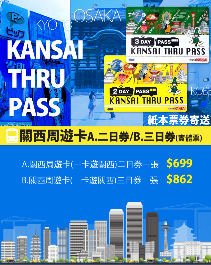 ■■ KANSAI -THRU -PASS □■ 是一種乘車卡,用這張卡,能夠自由乘坐關西一帶的地鐵、私鐵及巴士。該卡還能用於大阪、神戶、京都以至奈良、和歌山、高野山的觀光旅遊。KANSAI THRU PASS乘車卡分別為2日、3日用,可根據遊程購入,使用KANSAI THRU PASS使您的旅遊經濟實惠、更添樂趣。