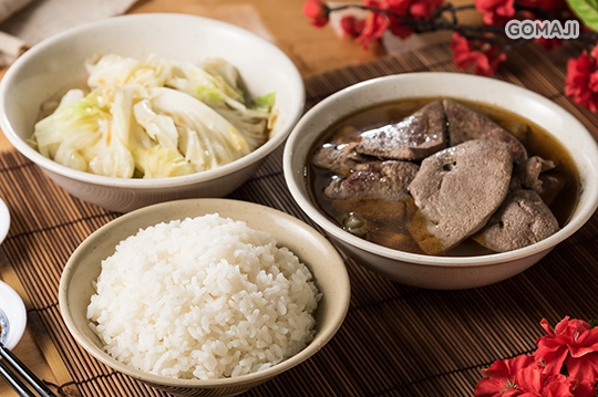 麻油豬肝一份 + 麻油青菜一份 + 白飯一碗