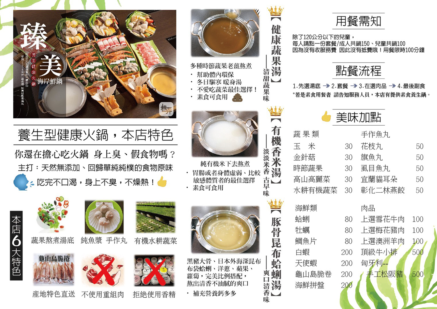 堅持天然,不使用味素,純蔬果熬煮的健康湯底