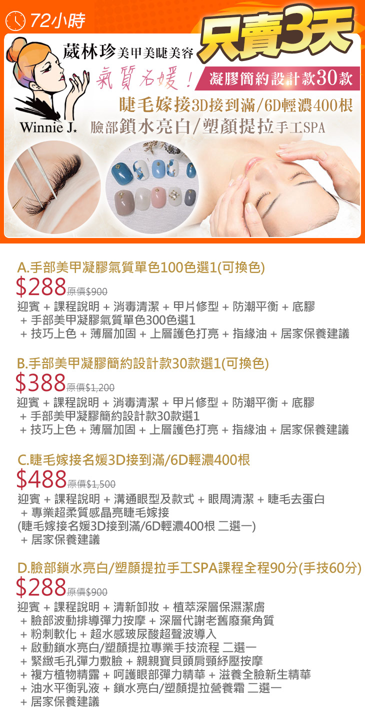 A.手部美甲凝膠氣質單色100色選1(可換色) / B.手部美甲凝膠簡約設計款30款選1(可換色) / C.睫毛嫁接名媛3D接到滿/6D輕濃400根 / D.臉部鎖水亮白/塑顏提拉手工SPA課程全程90分(手技60分)