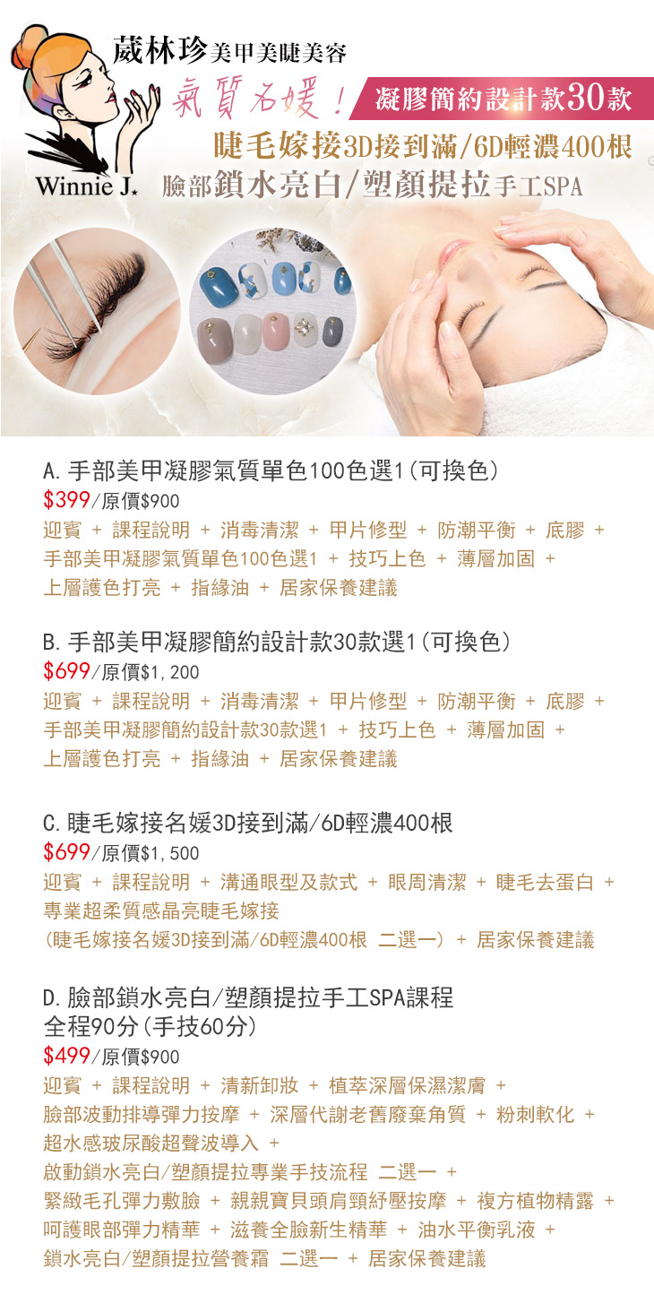 A.手部美甲凝膠氣質單色100色選1(可換色) / B.手部美甲凝膠簡約設計款30款選1(可換色) / C.睫毛嫁接名媛3D接到滿/6D輕濃400根 / D.臉部鎖水亮白/塑顏提拉手工SPA課程全程90分(手技60分)