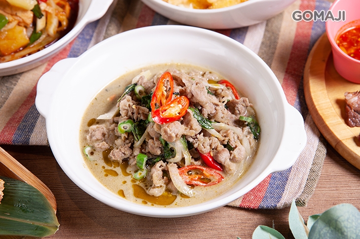 經典私藏 - 綠咖哩椰汁牛肉,以椰奶、各式香料、綠辣椒等食材調配而成的綠咖哩椰汁醬,微辣微甜,富有滑順濃厚的椰奶香,佐牛肉烹煮品嚐,肉嫩入味,單吃或添碗白飯搭配享用,都非常合適喲!