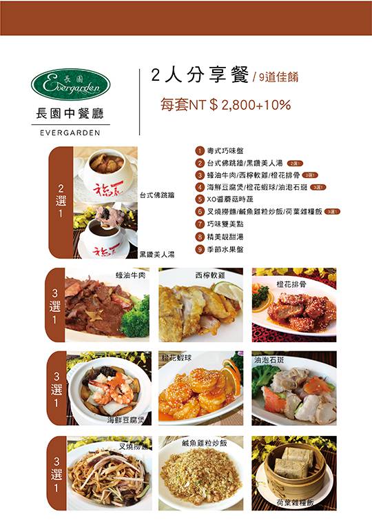 叉燒撈麵 橙花排骨 橙花明蝦球 油泡石斑 海鮮豆腐煲 碧綠蠔油牛肉 西檸軟雞 雞粒炒飯 荷葉雜糧飯 黑鑽美人湯 台式佛跳牆