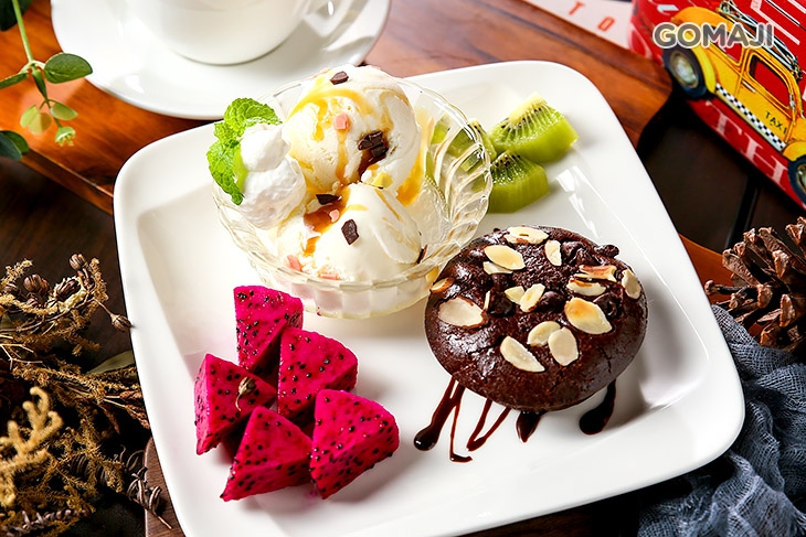 剛出爐的濃情布朗尼,配上冰涼的香草冰淇淋,香濃、經典的口味,是許多人的最愛!甜苦參半的布朗尼蛋糕,充滿豐厚濃郁的迷人可可香,熱騰騰地入口,享受令人著迷的可可風味在口中化開~實在是讓人幸福到不行!無論是佐上冰淇淋一同品嚐,亦或是和爽口的果物一起入口,都是絕佳風味!