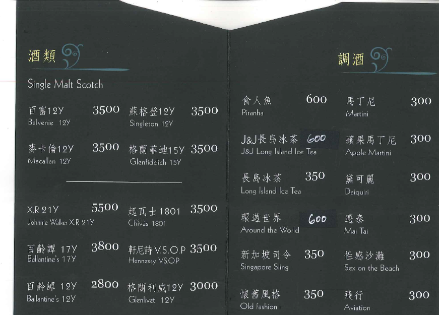 特別推薦:嫩煎牛小排、傳統德國豬腳、鮮生蠔佐主廚特調醬汁、嫩煎唐辛大干貝、Apple Martini、MaiTai、chinablue、Sex on the Beach