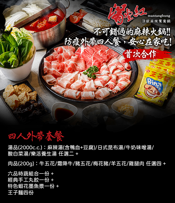 〈湯品(2000c.c.)麻辣湯(含鴨血+豆腐)/日式昆布湯/牛奶味噌湯/酸白菜湯/樂活養生湯 任選二 + 肉品(200g):牛五花/霜降牛/豬五花/梅花豬/羊五花/雞腿肉 任選四 + 六品時蔬組合一份 + 經典手工丸餃一份 + 特色蝦花墨魚漿一份 + 王子麵四份〉