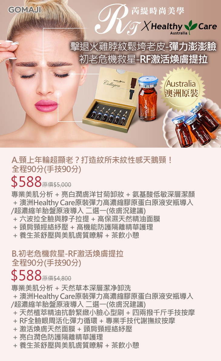 〈專業美肌分析 + 天然草本深層潔净卸洗 + 澳洲Healthy Care原裝彈力高濃縮膠原蛋白原液安瓶導入/超濃縮羊胎盤原液導入 二選一(依膚況建議) + 天然植萃精油抗齡緊緻小臉心型刷 + 四兩撥千斤手技按摩 + RF全臉眼周活化彈力循環 + 專業手技代謝撫紋按摩 + 激活煥膚天然面膜 + 頭肩頸經絡紓壓 + 亮白潤色防護隔離精華護理 + 養生茶舒壓與美肌膚質瞭解 + 茶飲小憩〉