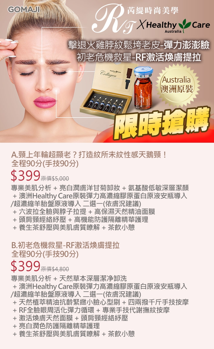 〈專業美肌分析 + 天然草本深層潔净卸洗 + 澳洲Healthy Care原裝彈力高濃縮膠原蛋白原液安瓶導入/超濃縮羊胎盤原液導入 二選一(依膚況建議) + 天然植萃精油抗齡緊緻小臉心型刷 + 四兩撥千斤手技按摩 + RF全臉眼周活化彈力循環 + 專業手技代謝撫紋按摩 + 激活煥膚天然面膜 + 頭肩頸經絡紓壓 + 亮白潤色防護隔離精華護理 + 養生茶舒壓與美肌膚質瞭解 + 茶飲小憩〉