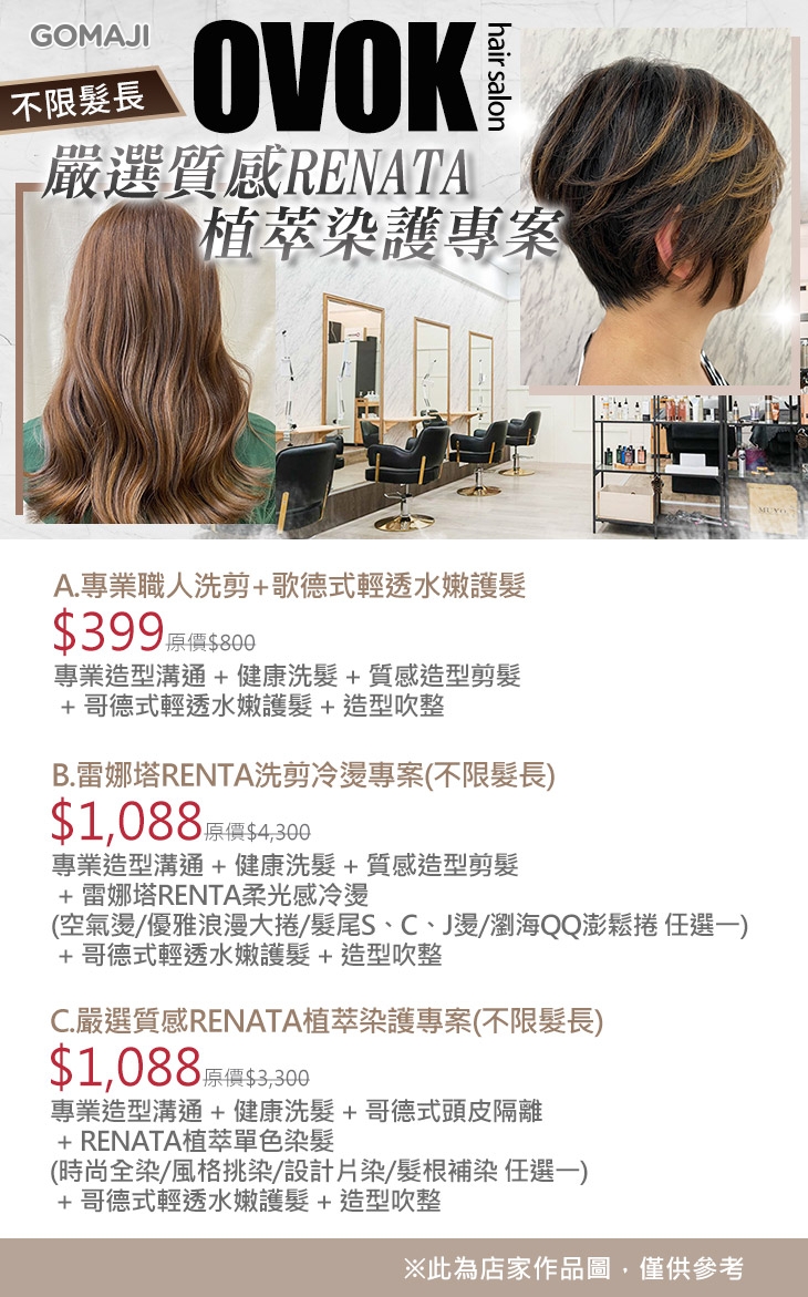 A.專業職人洗剪+歌德式輕透水嫩護髮 / B.雷娜塔RENTA洗剪冷燙專案(不限髮長) / C.嚴選質感RENATA植萃染護專案(不限髮長)