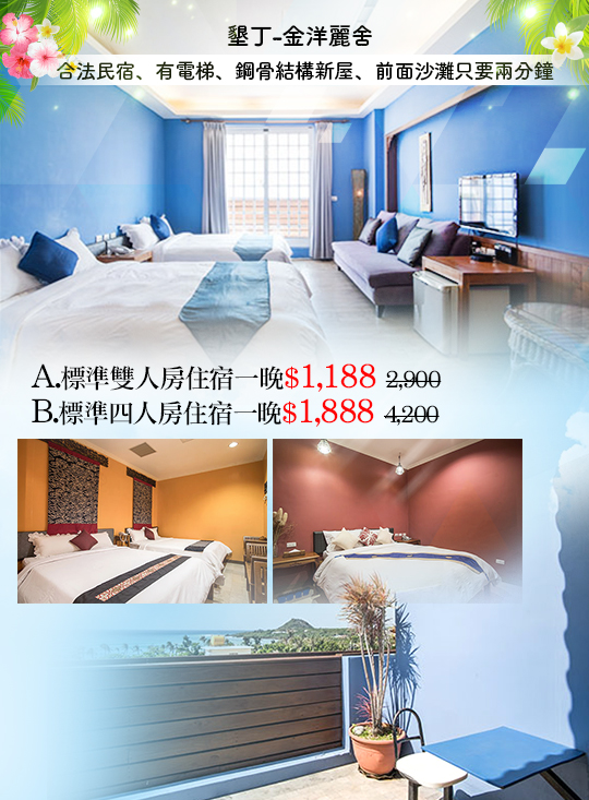 開闊的藍天與溫暖陽光帶給身心無限舒暢,海風輕輕吹來,拋開所有束縛,來到墾丁就是該無後顧之憂的展開一場魅力四射的海洋假期!走進金洋麗舍映入眼簾的便是富有渡假風情的擺設,經認證的合法民宿,設有電梯更添便利,距離沙灘也只要兩分鐘,是您暢玩墾丁的最佳選擇!