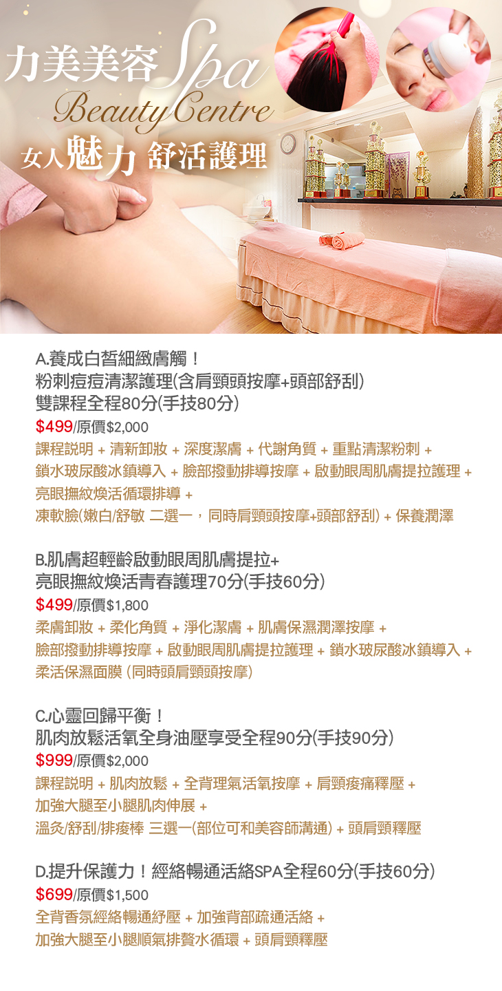A.養成白皙細緻膚觸!粉刺痘痘清潔護理(含肩頸頭按摩+頭部舒刮)雙課程全程80分(手技80分) / B.肌膚超輕齡啟動眼周肌膚提拉+亮眼撫紋煥活青春護理70分(手技60分) / C.心靈回歸平衡!肌肉放鬆活氧全身油壓享受全程90分(手技90分) / D.提升保護力!經絡暢通活絡SPA全程60分(手技60分)