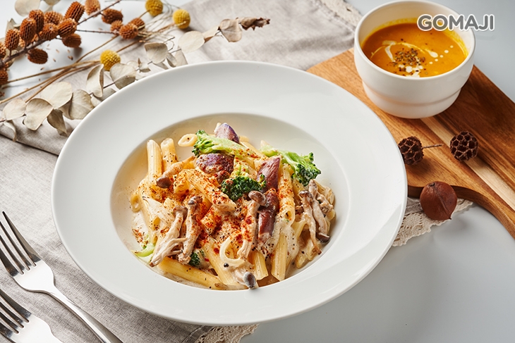 香濃馥郁的白醬,搭配彈牙通心粉義大利麵,義大利菜色中經典的菜色,沒想到在全素餐廳中也能夠吃到!使用全素食材精心調配出來的雪白醬汁,口感溫醇,或許是因為少了動物性乳製品的關係,整體味道清爽卻又不失濃郁,絕妙美味,您一定要品嚐看看!