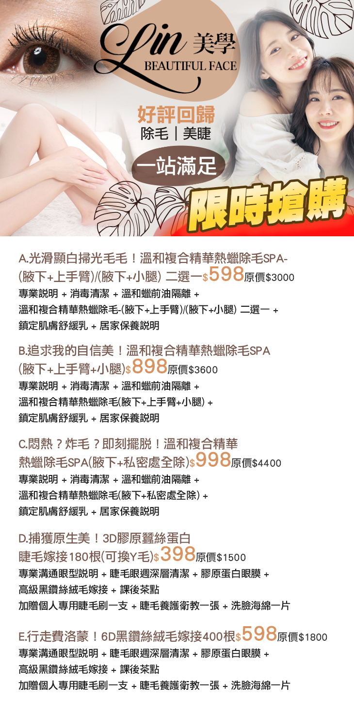 A.光滑顯白掃光毛毛!溫和複合精華熱蠟除毛SPA-(腋下+上手臂)/(腋下+小腿) 二選一 / B.追求我的自信美!溫和複合精華熱蠟除毛SPA(腋下+上手臂+小腿) / C.悶熱?炸毛?即刻擺脫!溫和複合精華熱蠟除毛SPA(腋下+私密處全除) / D.捕獲原生美!3D膠原蠶絲蛋白睫毛嫁接180根(可換Y毛) / E.行走費洛蒙!6D黑鑽絲絨毛嫁接400根