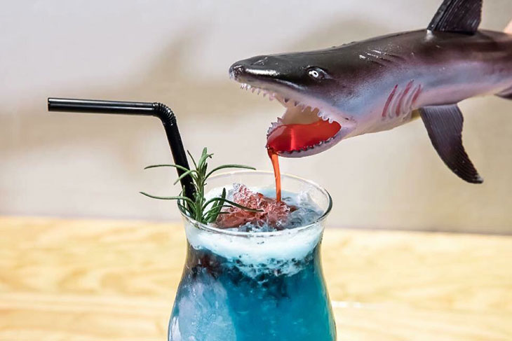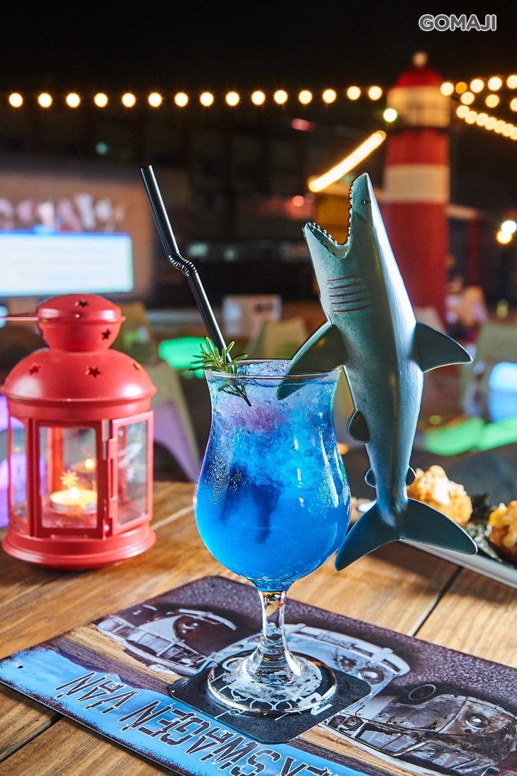 外型顯眼的鯊魚吐血,透明水藍色的酒色與一旁的小鯊魚搭配,更突顯了海洋微光優遊自在的海洋風氣。