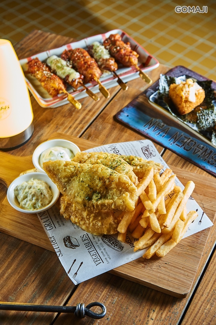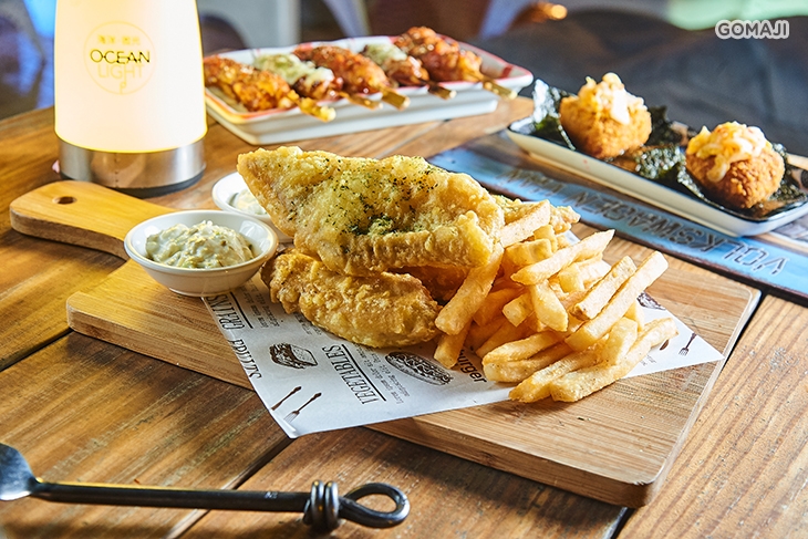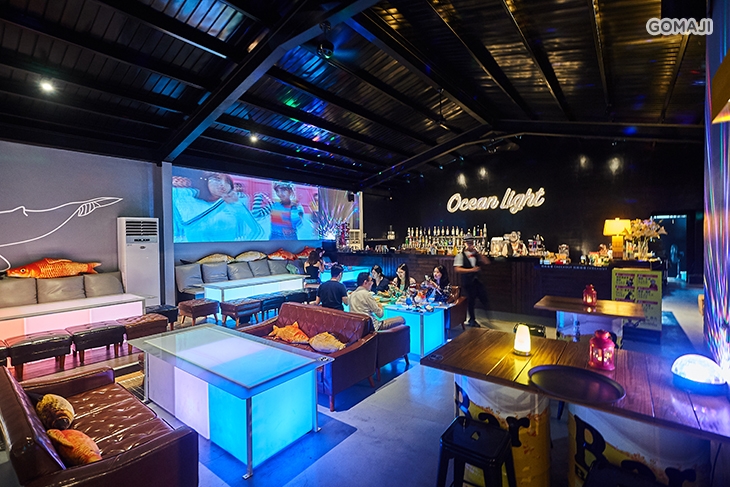 ➽ 如果人數比較多還可以選擇空間比較大的沙發坐座位區。沙發上的魚型抱枕和LED發光餐桌也充分傳達了海洋微光的特色。
