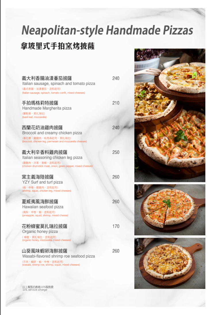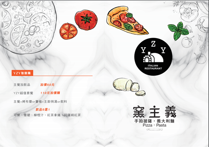 近遠東SOGO百貨中壢店!以窯烤料理為特色的YZY窯主義手拍披薩,提供各式美味義式料理:義大利麵、披薩、炸物等等,店家對料理的用心、手藝的追求,希望帶給顧客從道道餐點中,能體驗到異國的風味與佳餚的美味,讓您雙味一次擁有!另外,餐廳的裝潢以深暗色系為主,沒有過多華麗、浮誇的裝飾佈置,僅以簡單木與鐵元素來呈現。整體用餐環境舒適、寬敞,非常適合家人、朋友、情侶來此用餐聚會喲!