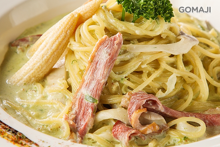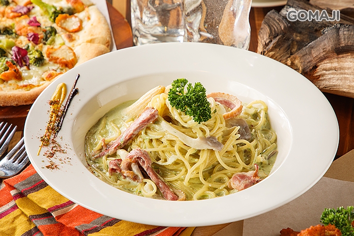。香蔥奶醬野菇燻鴨胸義大利麵。