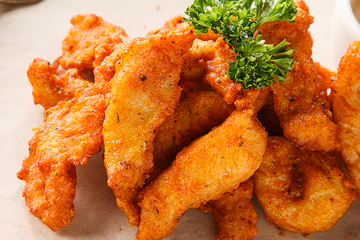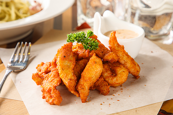 鮮嫩多汁的香酥雞柳條,一口咬下,雞柳香氣伴隨熱氣散開,搭配優格酸橙醬一起品嚐,酸甜口感、清爽不膩,風味獨特新穎。