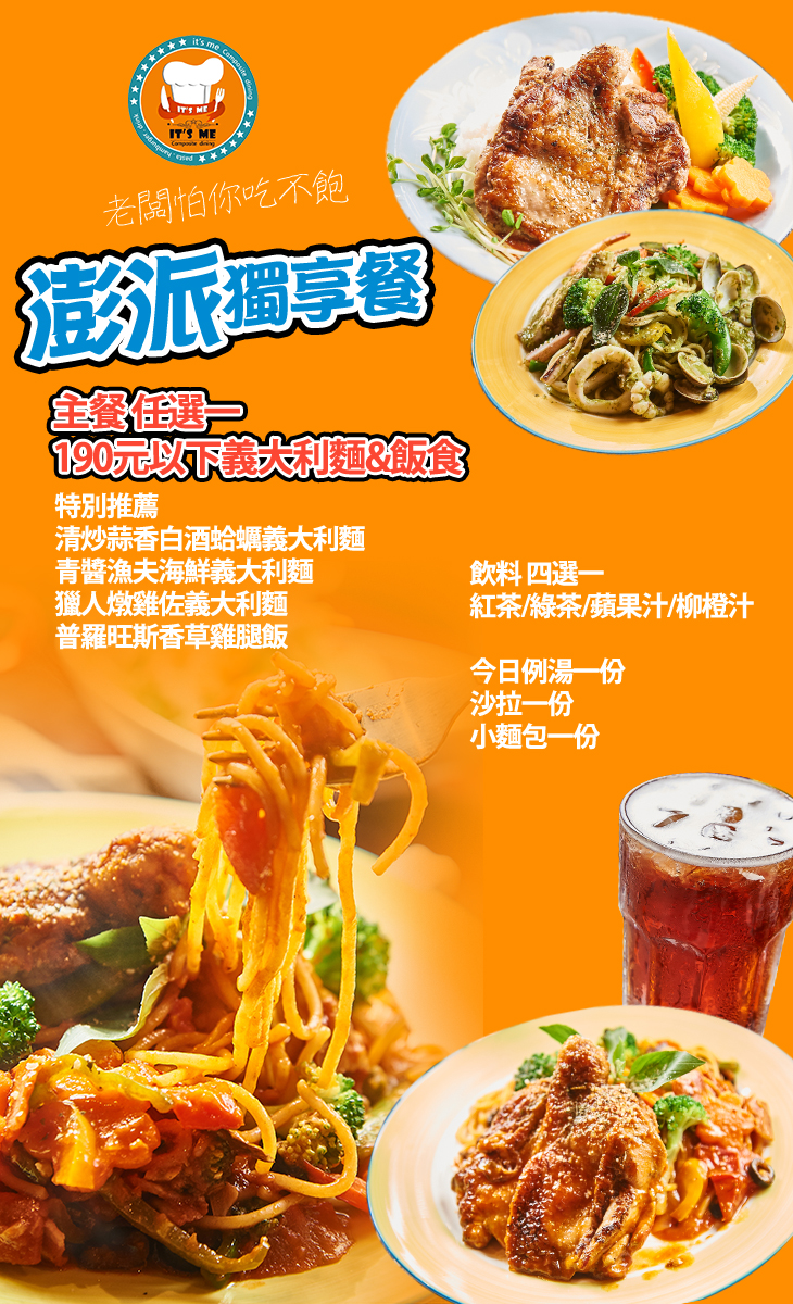 位於高雄市鳳山區裕昌街 45 號的 It's Me 複合式餐飲,專營美味的西式餐點,清炒蒜香白酒蛤蠣義大利麵、青醬漁夫海鮮義大利麵、獵人燉雞佐義大利麵等噴香誘人的料理,首波合作,要搶要快,機會難得。