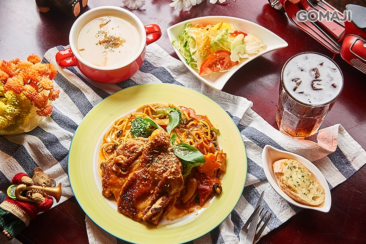 〈主餐:190元以下義大利麵&飯食任選一(特別推薦:清炒蒜香白酒蛤蠣義大利麵、青醬漁夫海鮮義大利麵、獵人燉雞佐義大利麵、普羅旺斯香草雞腿飯) + 飲料:紅茶/綠茶/蘋果汁/柳橙汁 四選一 + 今日例湯一份+ 沙拉一份 + 小麵包一份〉