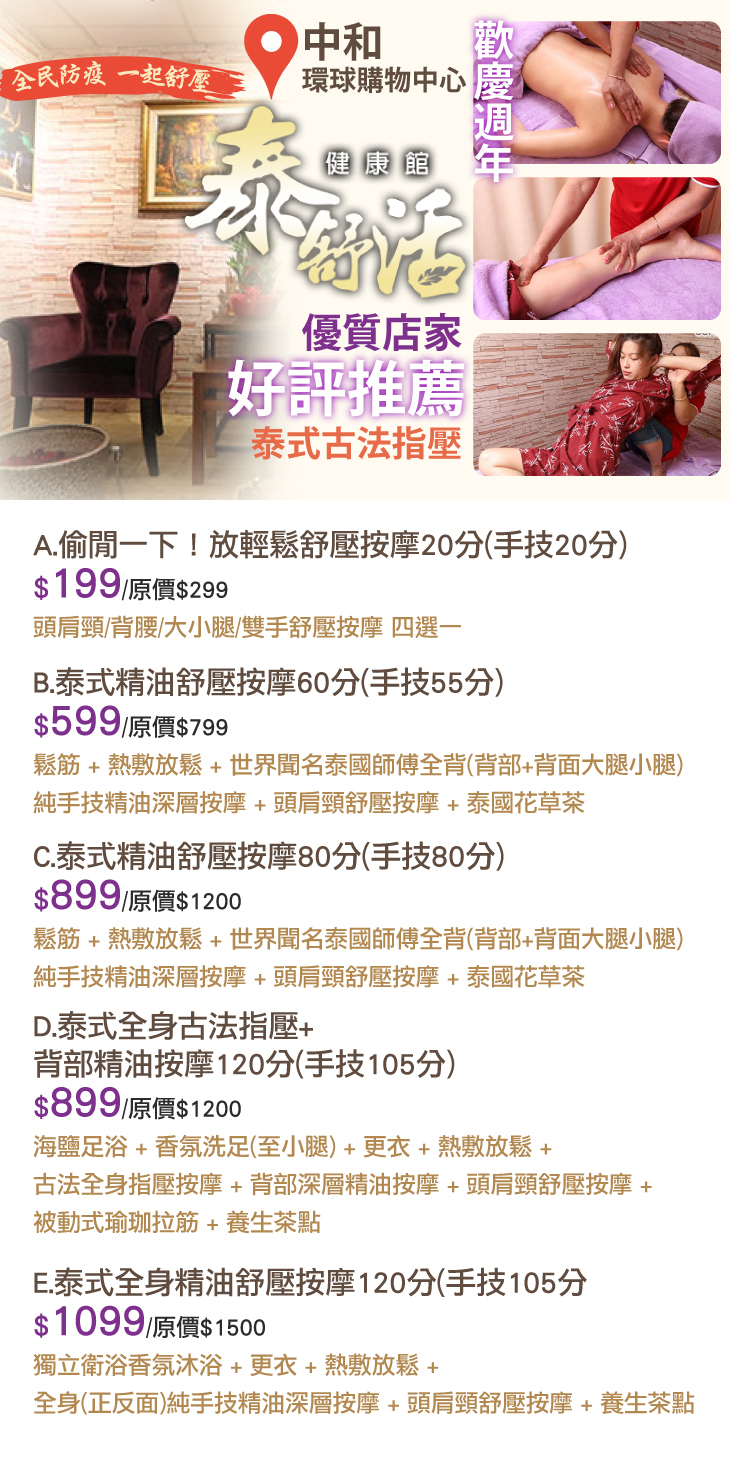 A.偷閒一下!放輕鬆舒壓按摩20分(手技20分) / B.泰式精油舒壓按摩60分(手技55分) / C.泰式精油舒壓按摩80分(手技80分) / D.泰式全身古法指壓+背部精油按摩120分(手技105分) / E.泰式全身精油舒壓按摩120分(手技105分)