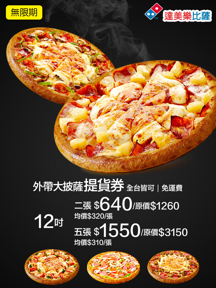限量!達美樂就是好吃!來店外帶12吋大披薩提貨優惠券(無限期;麻吉好康:本券另可用100元優惠價加購2支轟炸雞腿(原價140元))