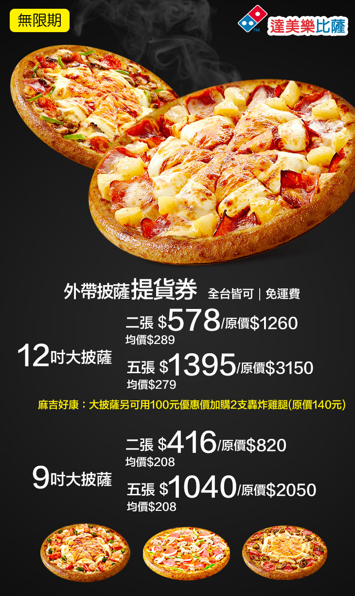 激戰限量必搶24hr!達美樂就是好吃!來店外帶12吋大披薩提貨優惠券/9吋小披薩提貨優惠券(無限期;麻吉好康:大披薩另可用100元優惠價加購2支轟炸雞腿(原價140元))