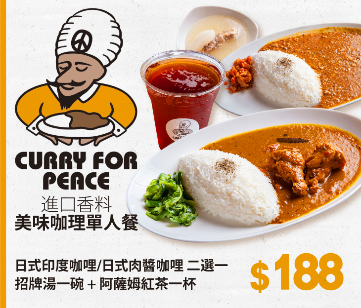 咖哩──被廣泛運用在各國料理中的菜色,不同國家的咖哩,都有其不同的風味,【Curry For Peace】尋訪、品嚐全世界各式各樣的咖哩,並不斷反覆研究香料,挑選新鮮上好的食材,創造出風味獨到、健康美味,怎麼吃都吃不膩的咖哩!鄰近捷運信義安和站,台北信義光復南路的小巷內,【Curry For Peace】的咖哩擺盤看似簡單,卻藏不住咖哩的香氣,在巷口,便能聞到濃濃的咖哩香~【Curry For Peace】堅持使用最好的辛香料,細心調配出各種風味的咖哩,希望透過咖哩的美味,能夠撫慰每一位來客的胃腸與心靈。