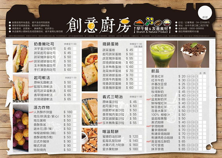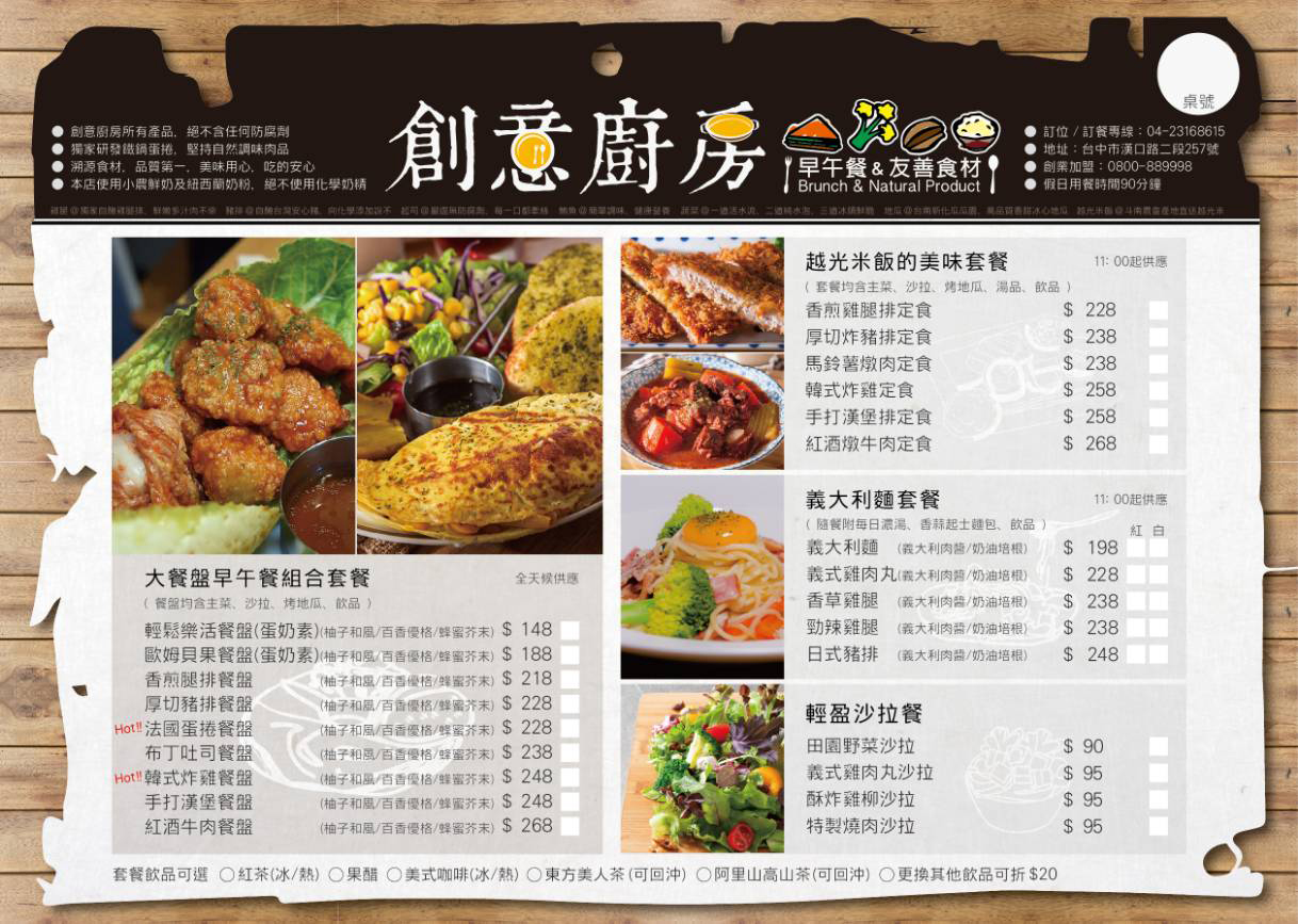 「一天的活力就從早餐開始,除了要吃得營養、吃得豐盛,還要吃得有創意。」位於台中市西屯區上的創意廚房,提供各式早午餐點,無論是排餐、定食、義大利麵、蛋捲、鬆餅等,包羅萬象的選擇,絕對讓您不知從何選起!食材選用新鮮、餐點製作美味!更特別的是,在餐廳的裝潢設計上,以大面積落地玻璃取代牆面,讓採光更明亮!空間更延伸!也讓顧客在聊天、用餐的過程中,無論晴天、雨天都能欣賞到不一樣的風景!還等什麼,趕緊將它放入必吃必訪的口袋名單裡吧!