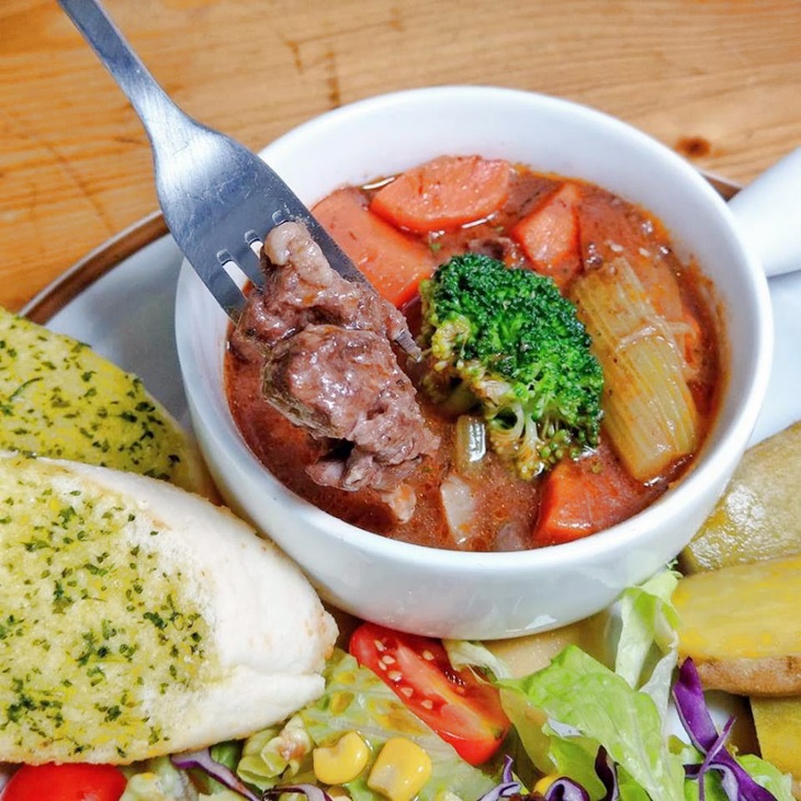 經過店家細心熬煮多時的紅酒燉牛肉,滋味鮮甜入味、肉質軟嫩;搭配豐富的五色蔬菜讓人補充一整天的營養!白飯拌入湯汁中令人食慾大開!牛肉獨有的香氣再加上嚴選紅酒細火燉煮,大塊牛肉實在太銷魂了。