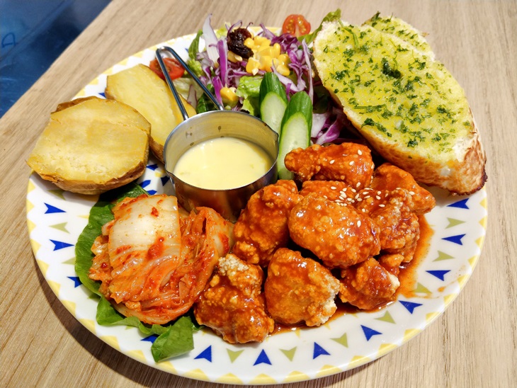 韓式炸雞獨有的甜鹹醬汁,令人食指大動!滿滿~一大盤有新鮮生菜沙拉也有豐富鈣質地瓜、烤得酥脆的法國麵包;一整天的營養都幫妳照顧到囉!大人小孩都愛的韓式炸雞不能錯過。