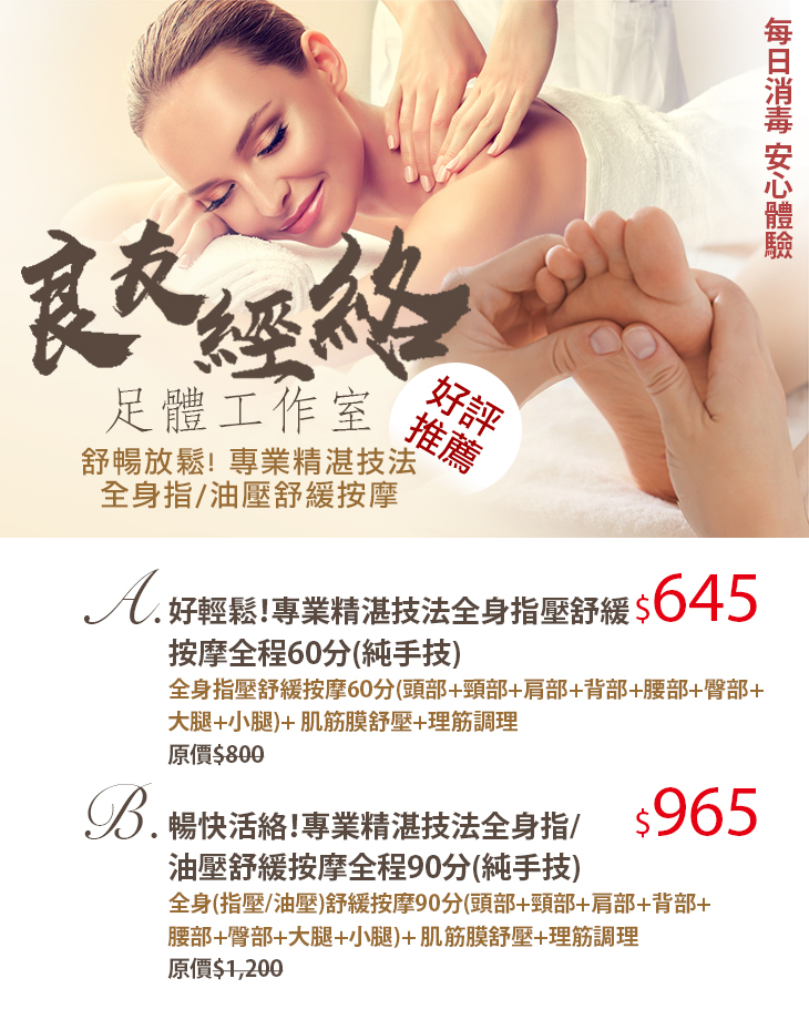 A.好輕鬆!專業精湛技法全身指壓舒緩按摩全程60分(純手技) / B.暢快活絡!專業精湛技法全身指/油壓舒緩按摩全程90分(純手技)