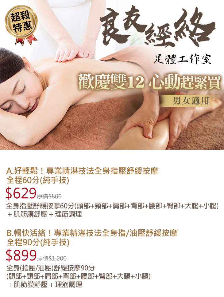 A.好輕鬆!專業精湛技法全身指壓舒緩按摩全程60分(純手技) / B.暢快活絡!專業精湛技法全身指/油壓舒緩按摩全程90分(純手技)